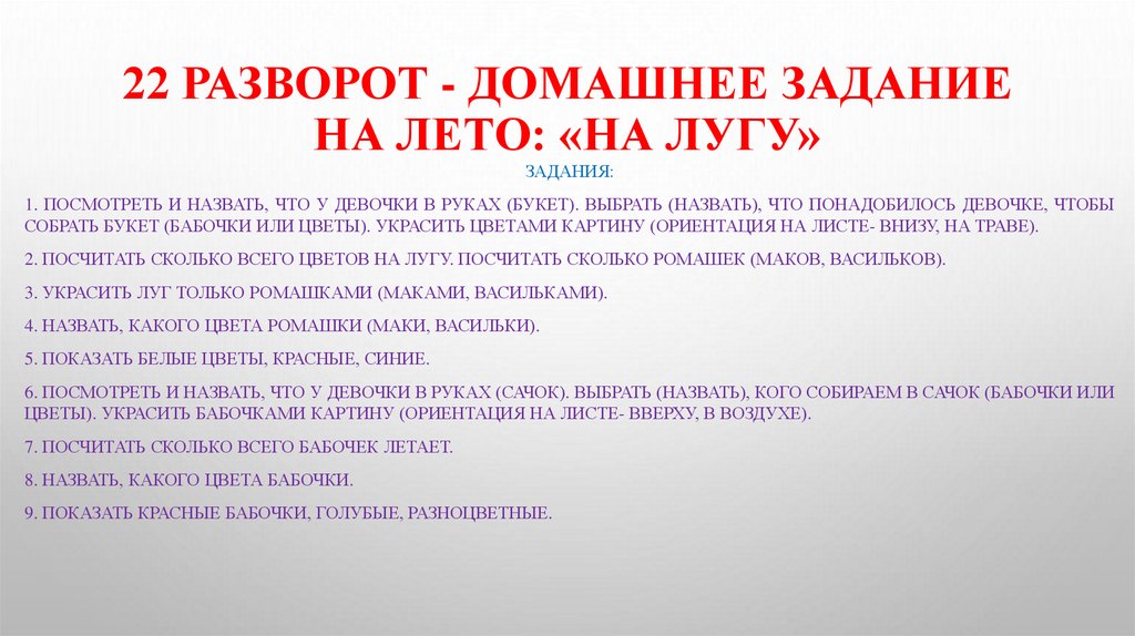 22 РАЗВОРОТ - ДОМАШНЕЕ ЗАДАНИЕНА ЛЕТО: «НА ЛУГУ»