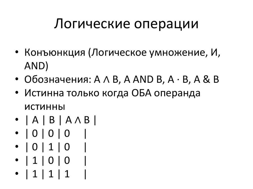 Логические операции• Конъюнкция (Логическое умножение, И,