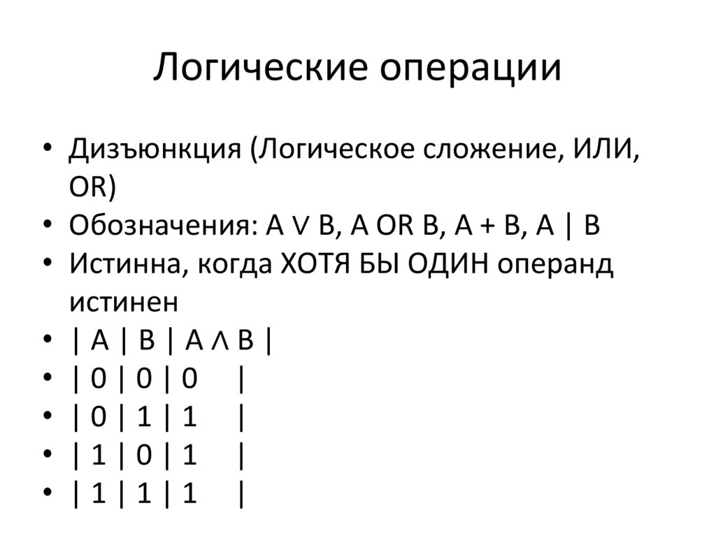 • Истинна, когда ХОТЯ БЫ ОДИН операнд