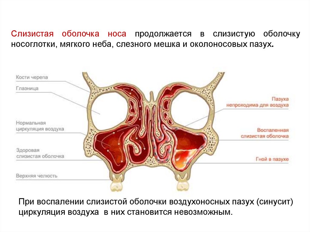 Слизистая оболочка носа продолжается в слизистую оболочкуносоглотки, мягкого неба, слезного мешка и околоносовых пазух.