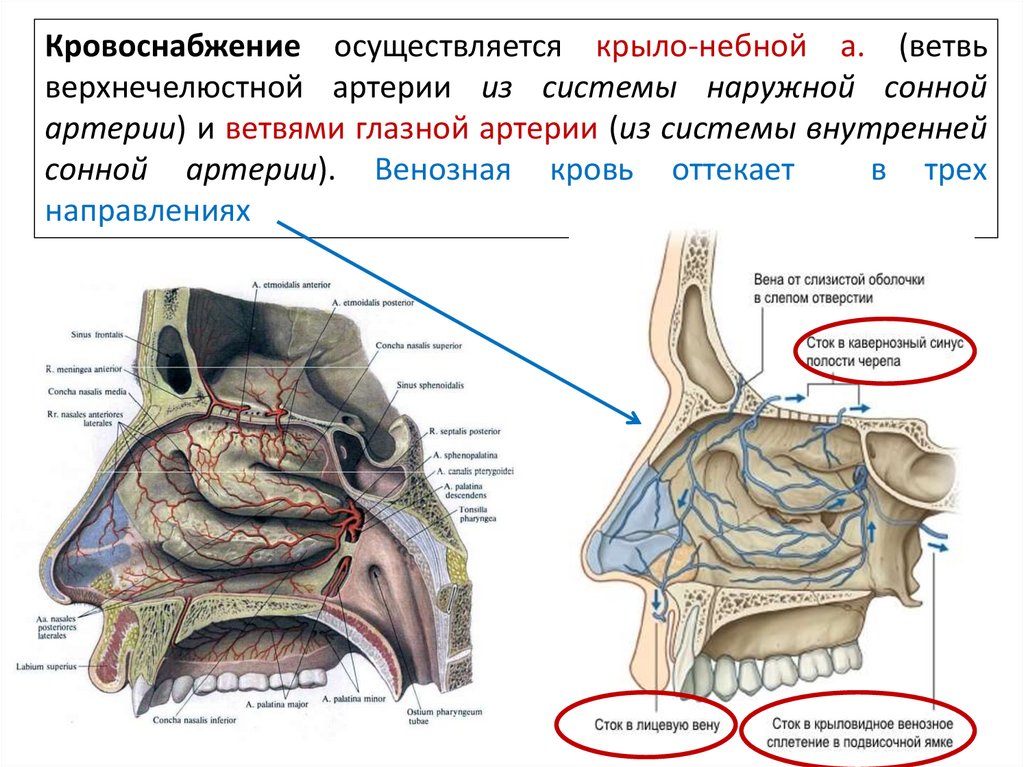 Кровоснабжение осуществляется крыло-небной а. (ветвьверхнечелюстной артерии из системы наружной сонной