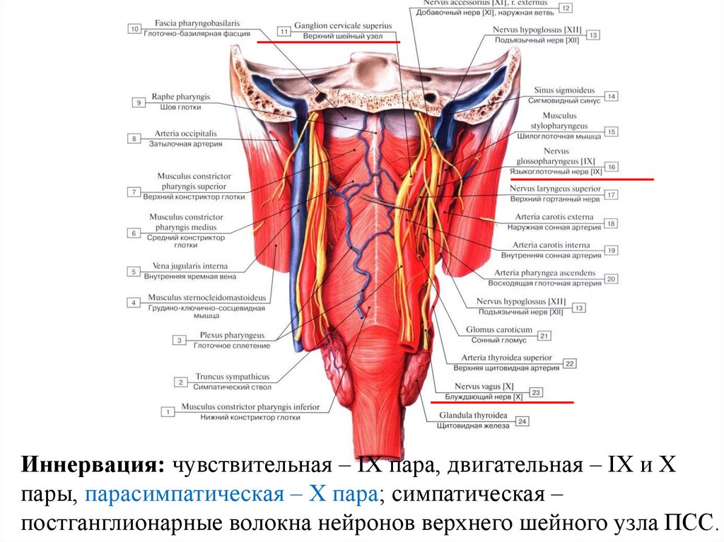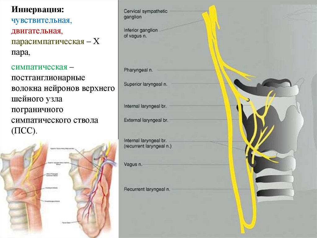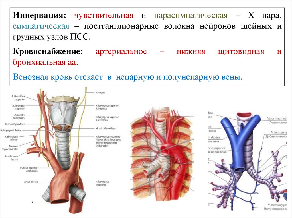 Иннервация: чувствительная и парасимпатическая – Х пара,симпатическая – постганглионарные волокна нейронов грудных