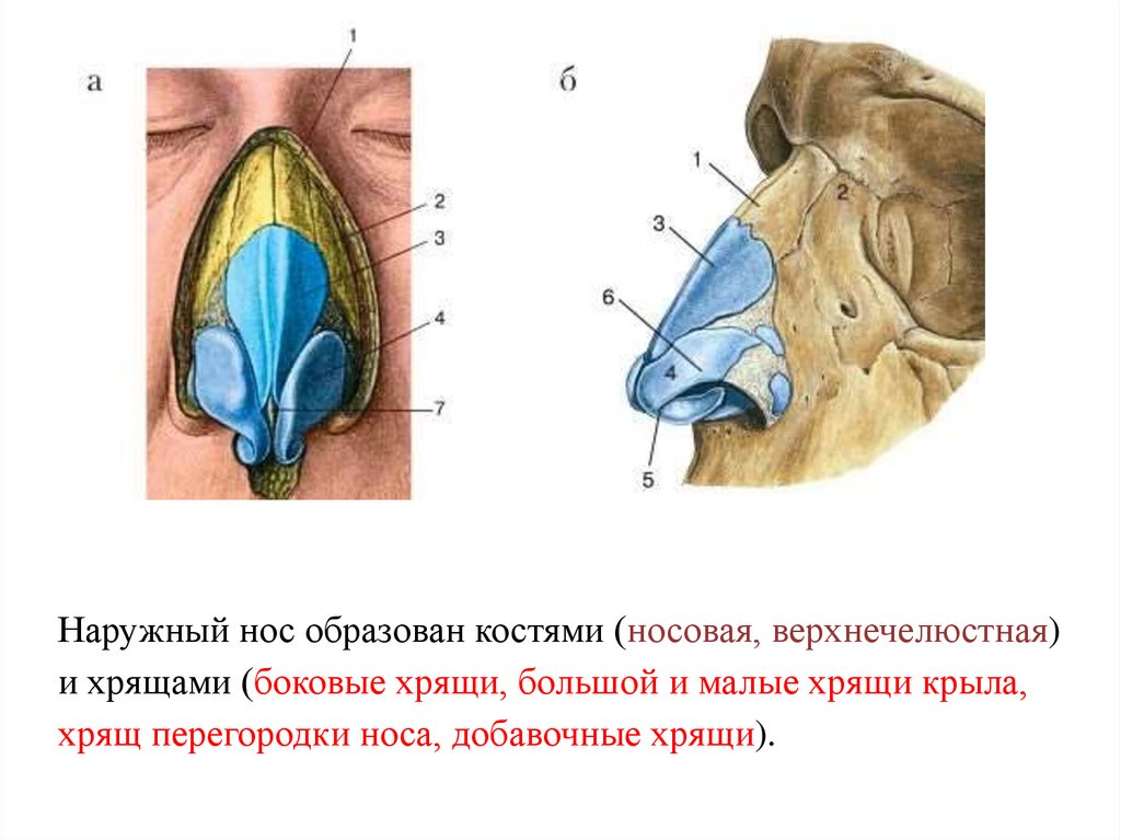 Наружный нос образован костями (носовая, верхнечелюстная)и хрящами (боковые хрящи, большой и малые хрящи крыла,