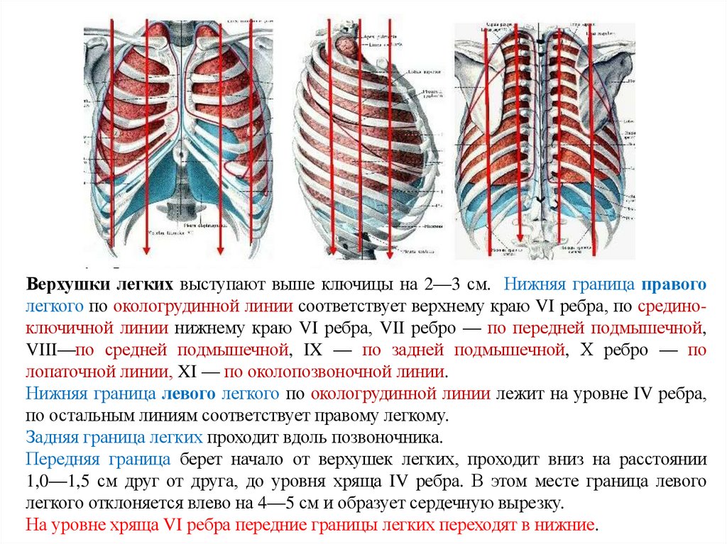 На уровне хряща VI ребра передние границы легких переходят в нижние.