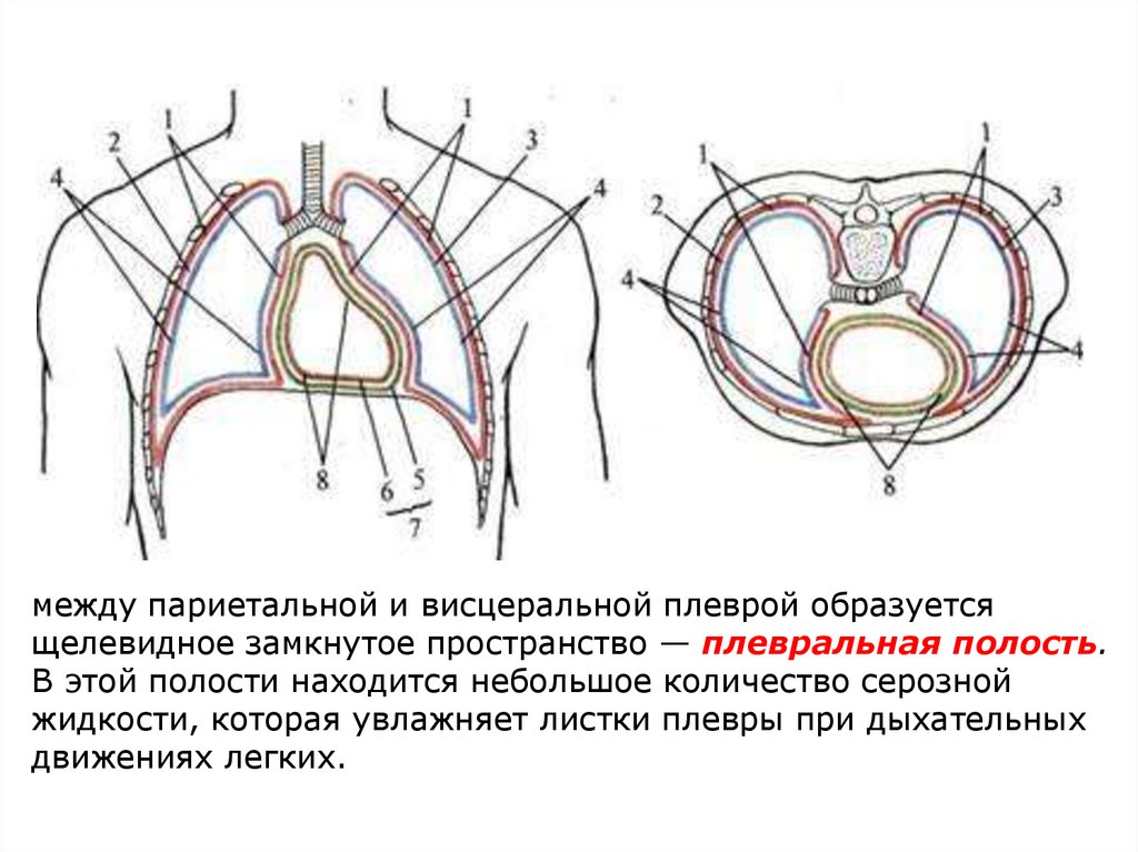 между париетальной и висцеральной плеврой образуетсящелевидное замкнутое пространство — плевральная полость.