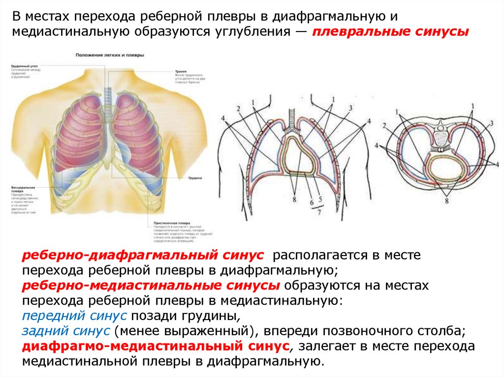 В местах перехода реберной плевры в диафрагмальную имедиастинальную образуются углубления — плевральные синусы.