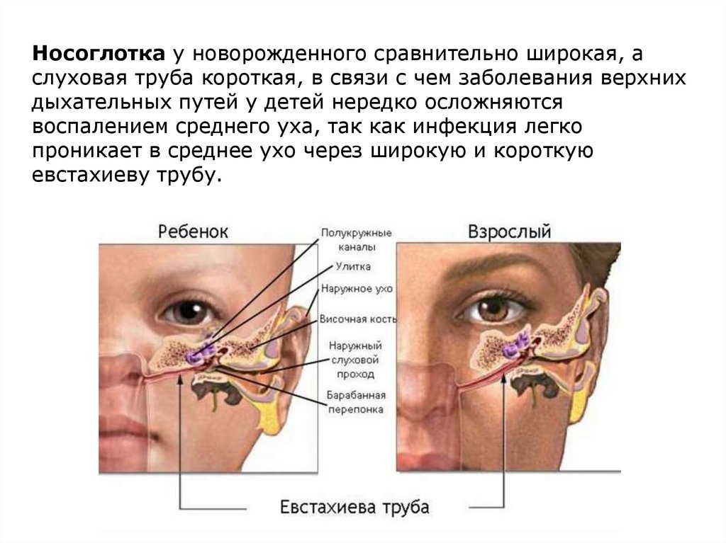 Носоглотка у новорожденного сравнительно широкая, аслуховая труба короткая, в связи с чем заболевания верхних