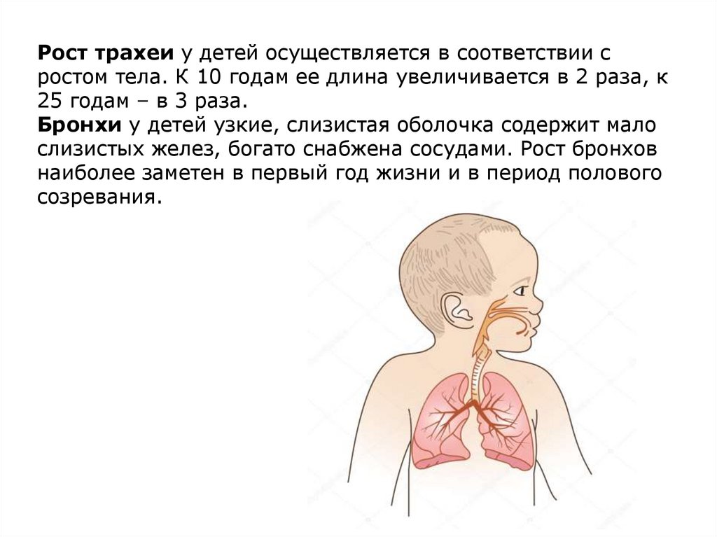 Рост трахеи у детей осуществляется в соответствии сростом тела. К 10 годам ее длина увеличивается в 2 раза, к