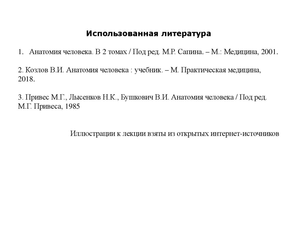 Использованная литература1. Анатомия человека. В 2 томах / Под ред. М.Р. Сапина. – М.: Медицина, 2001.