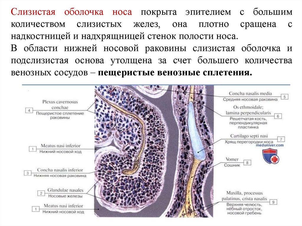Слизистая оболочка носа покрыта эпителием с большимколичеством слизистых желез, она плотно сращена с