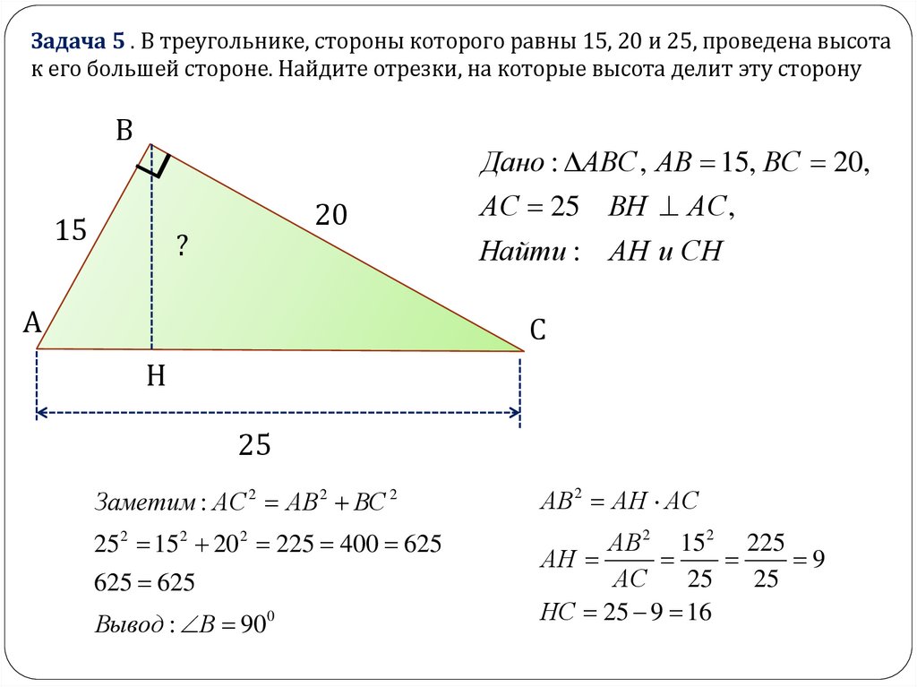 Задача 5 . В треугольнике, стороны которого равны 15, 20 и 25, проведена высотак его большей стороне. Найдите отрезки, на которые высота делит эту сторону