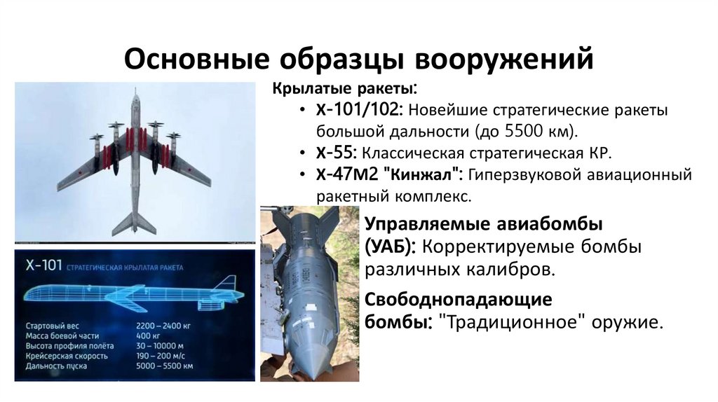Крылатые ракеты:• Х-101/102: Новейшие стратегические ракеты
