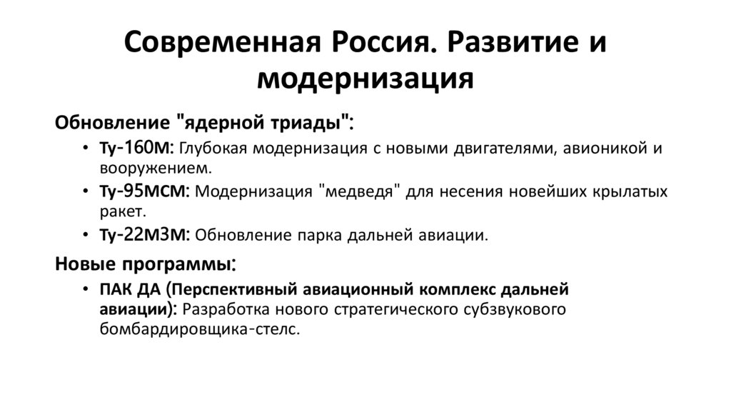 Обновление "ядерной триады":• Ту-160М: Глубокая модернизация с новыми двигателями, авионикой и