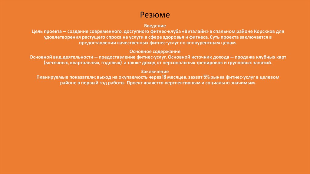 Планируемые показатели: выход на окупаемость через 18 месяцев, захват 5% рынка фитнес-услуг в целевом