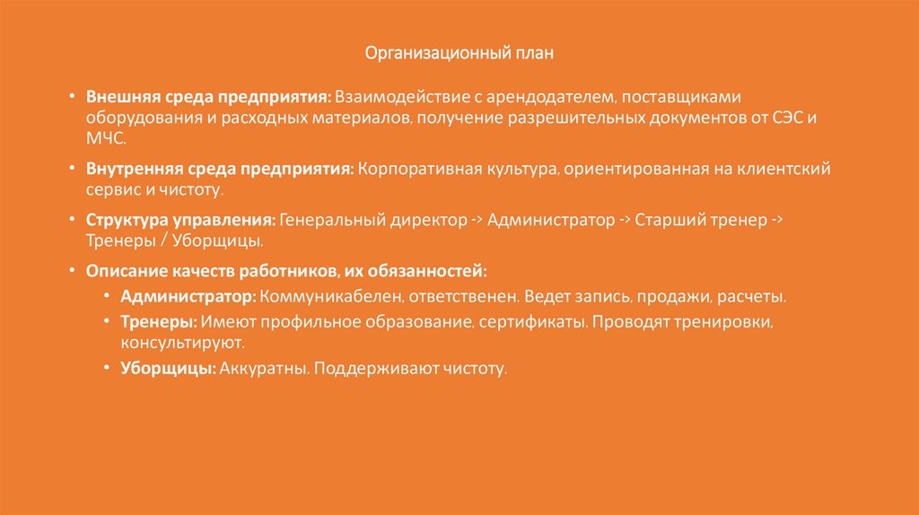 • Структура управления: Генеральный директор -> Администратор -> Старший тренер ->