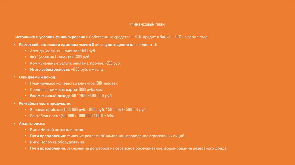 Источники и условия финансирования: Собственные средства — 60%, кредит в банке — 40% на срок 3 года.• Расчет себестоимости единицы услуги (1 месяц посещения для 1 клиента):