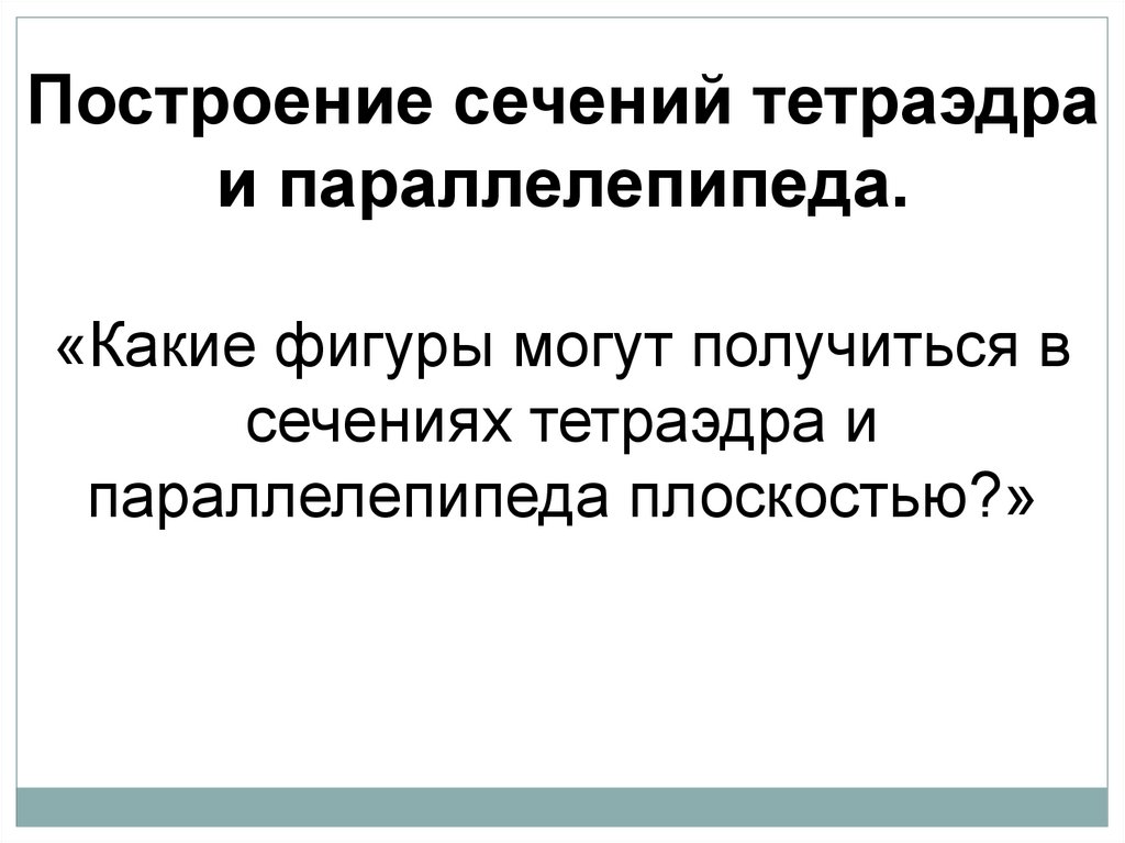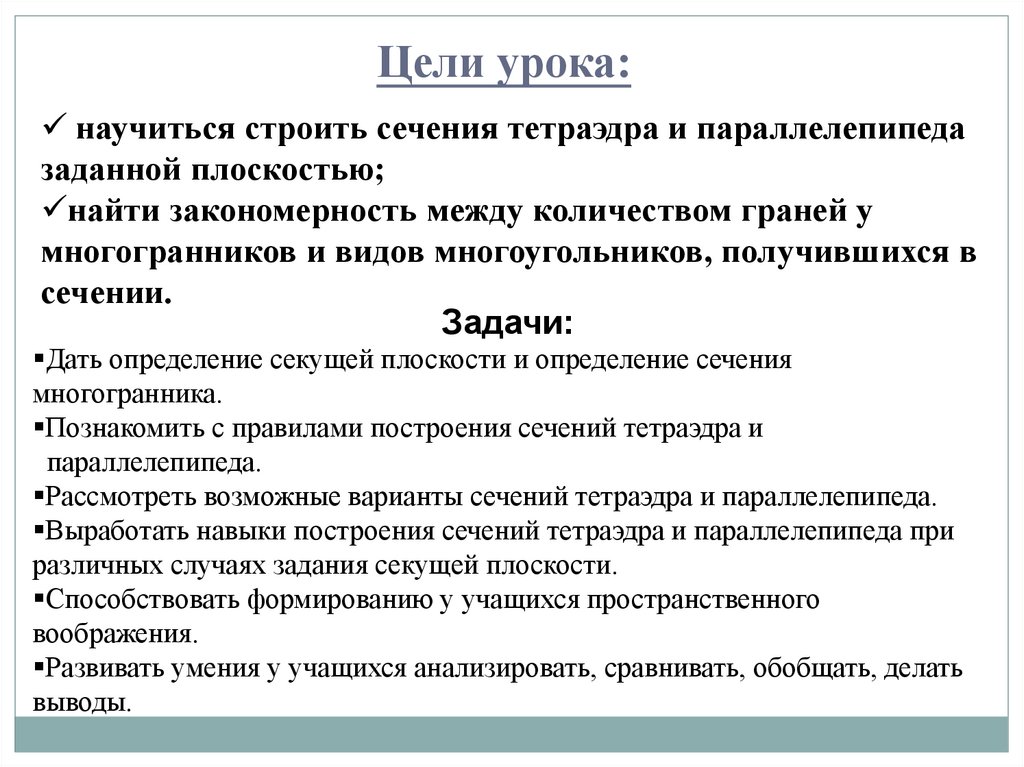 Выработать навыки построения сечений тетраэдра и параллелепипеда при