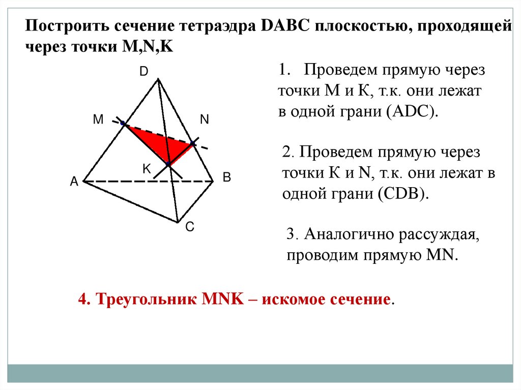 Построить сечение тетраэдра DABC плоскостью, проходящейчерез точки M,N,K