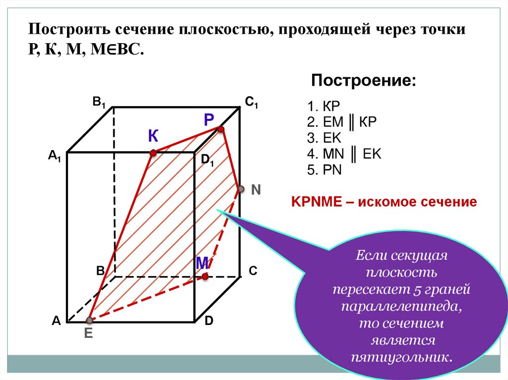 Построить сечение плоскостью, проходящей через точкиР, К, М, М∈ВС.