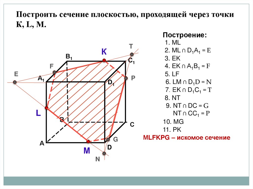 Построить сечение плоскостью, проходящей через точкиК, L, М.