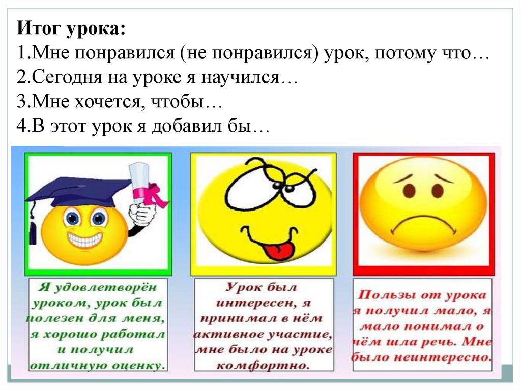 Итог урока:1.Мне понравился (не понравился) урок, потому что…