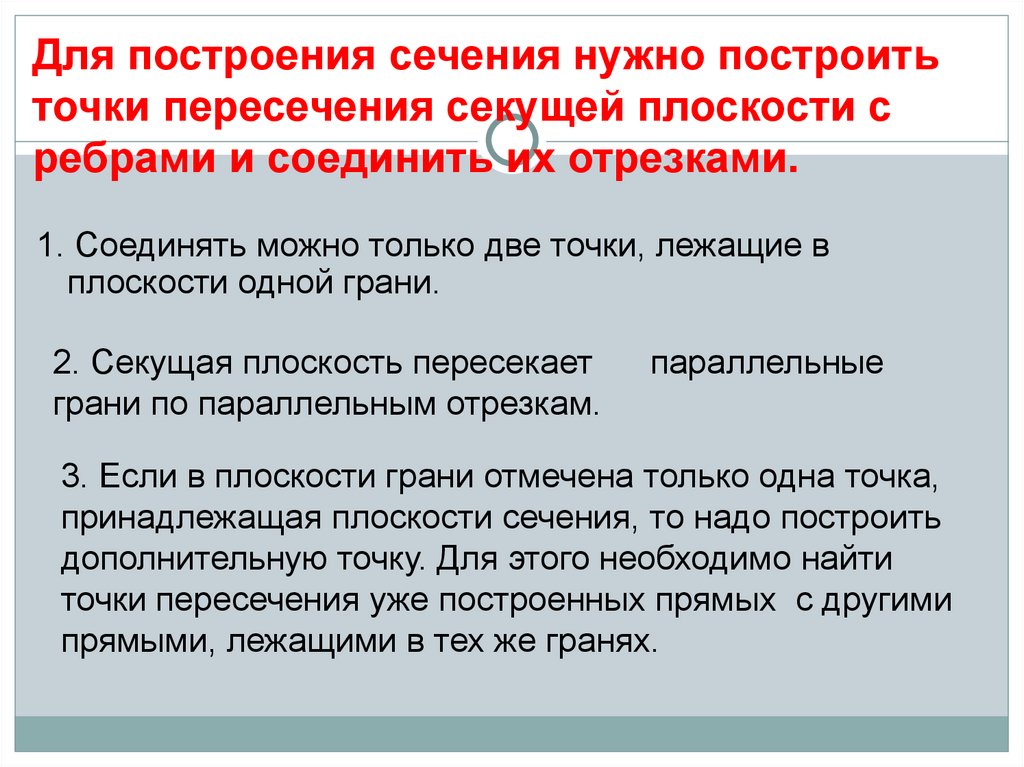 Для построения сечения нужно построитьточки пересечения секущей плоскости с