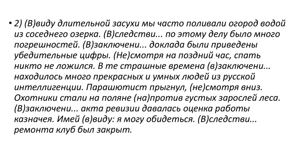• 2) (В)виду длительной засухи мы часто поливали огород водойиз соседнего озерка. (В)следстви... по этому делу было много