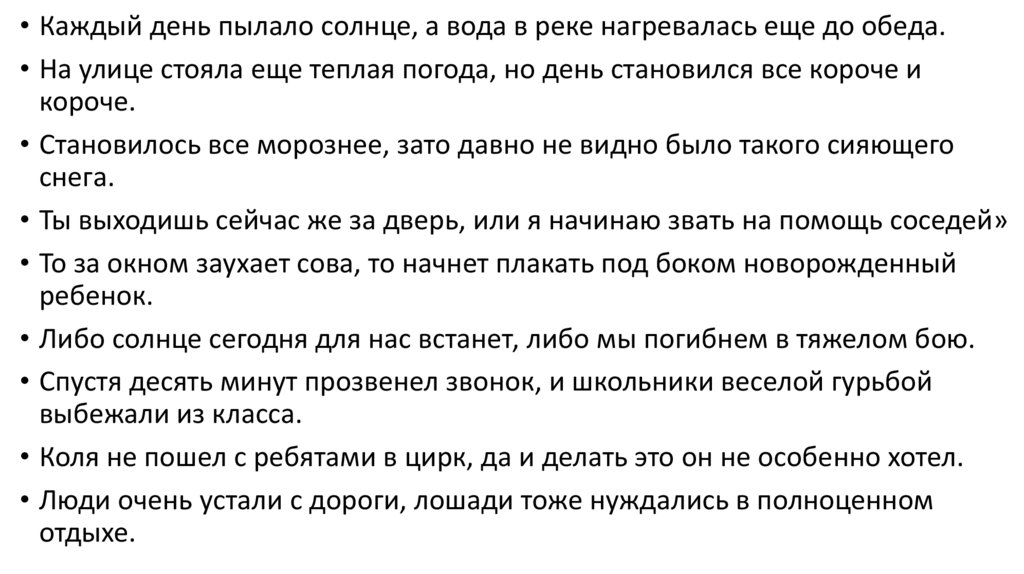 • Каждый день пылало солнце, а вода в реке нагревалась еще до обеда.• На улице стояла еще теплая погода, но день становился все короче и