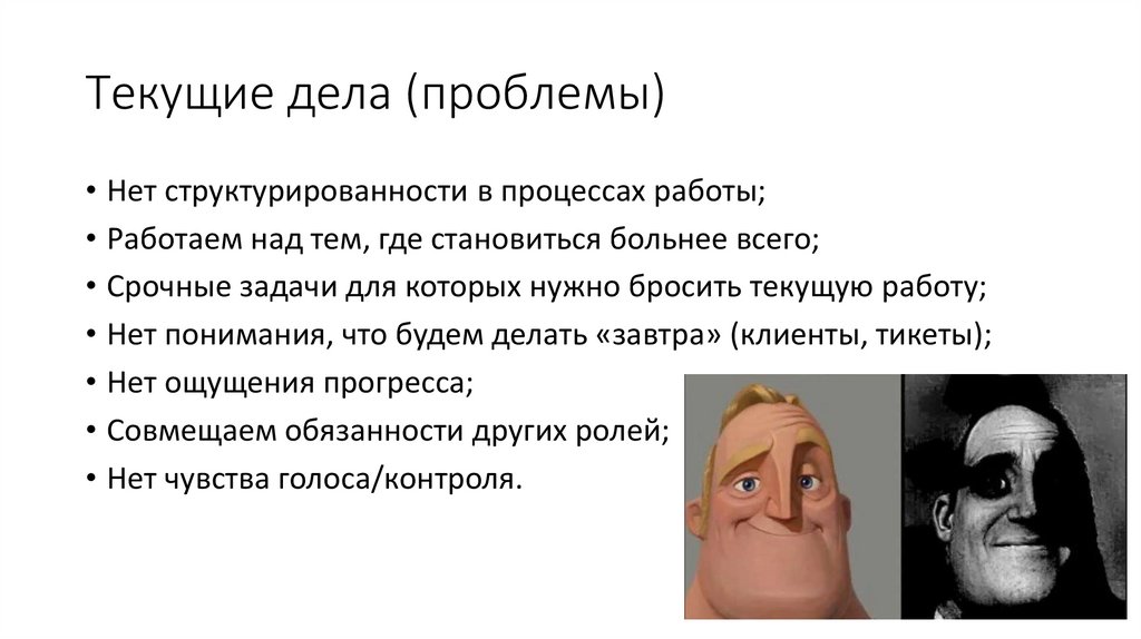 • Нет структурированности в процессах работы;• Работаем над тем, где становиться больнее всего;
