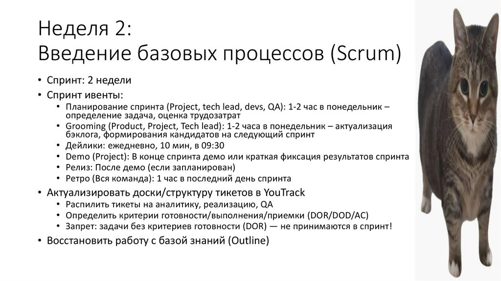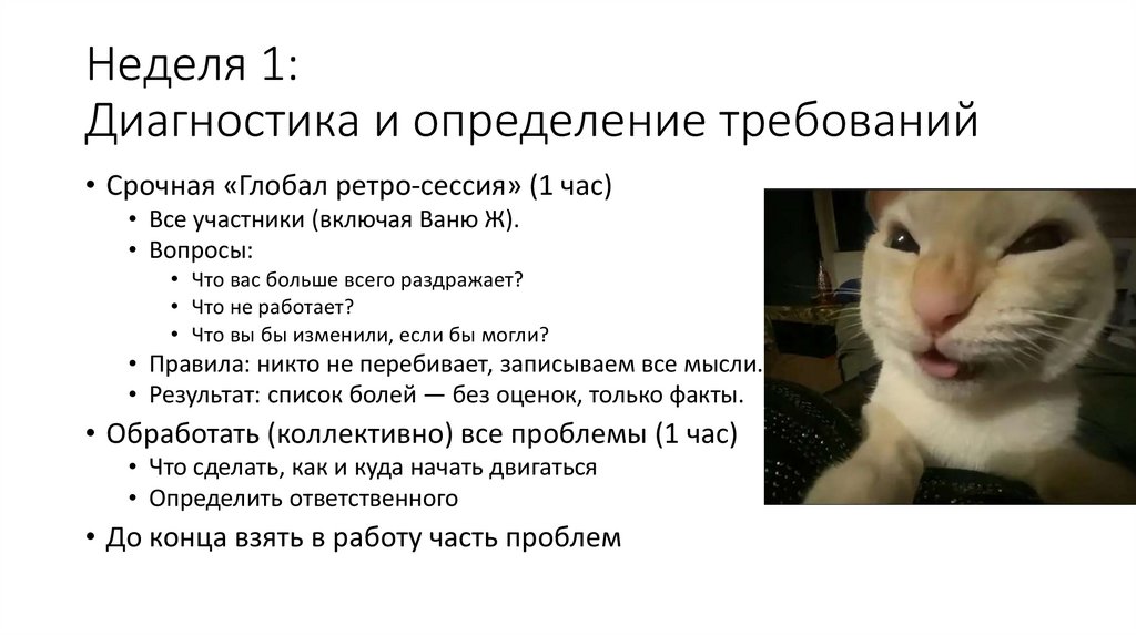 • Неделя 1: Диагностика и определение требований• Неделя 2: Введение базовых процессов (Scrum)
