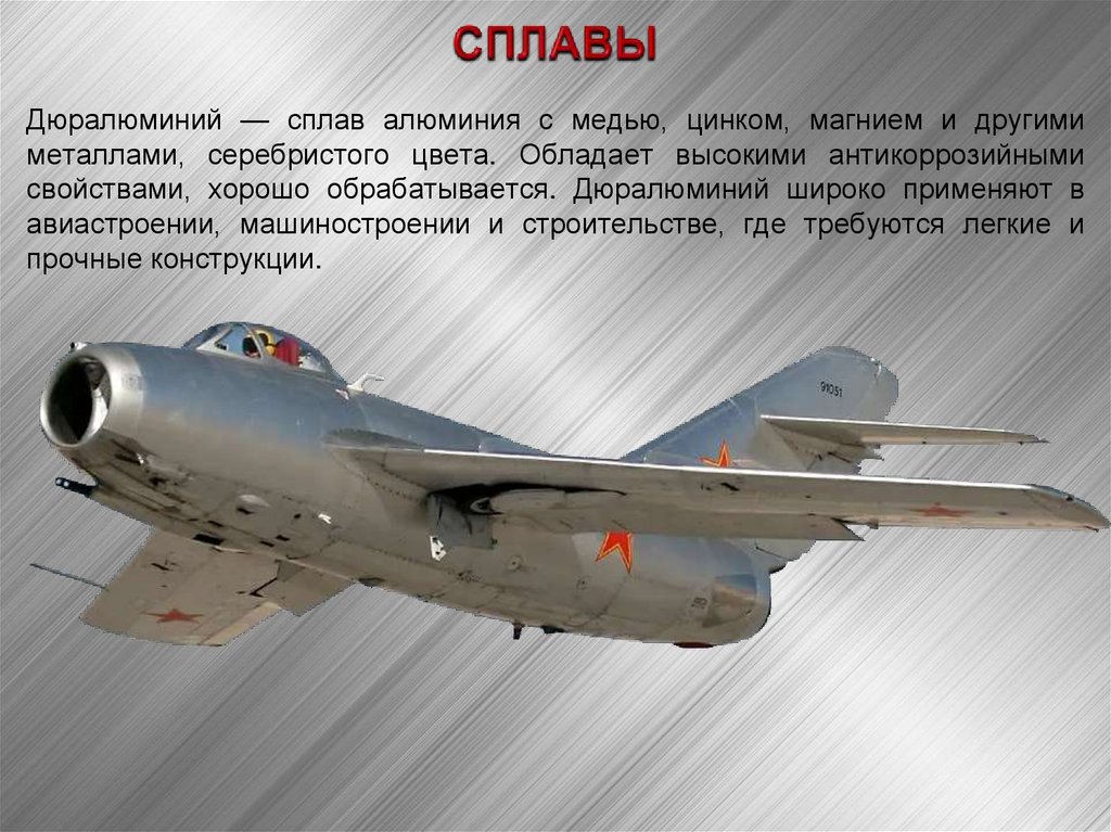 Дюралюминий — сплав алюминия с медью, цинком, магнием и другимиметаллами, серебристого цвета. Обладает высокими антикоррозийными