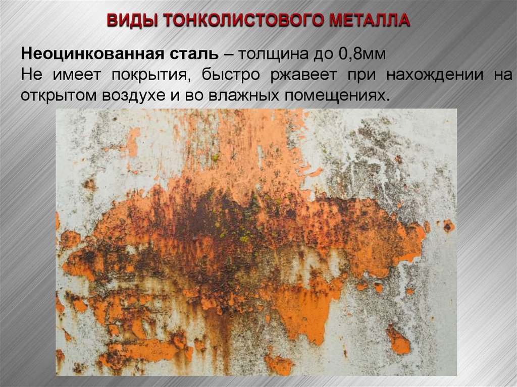 Неоцинкованная сталь – толщина до 0,8ммНе имеет покрытия, быстро ржавеет при нахождении на
