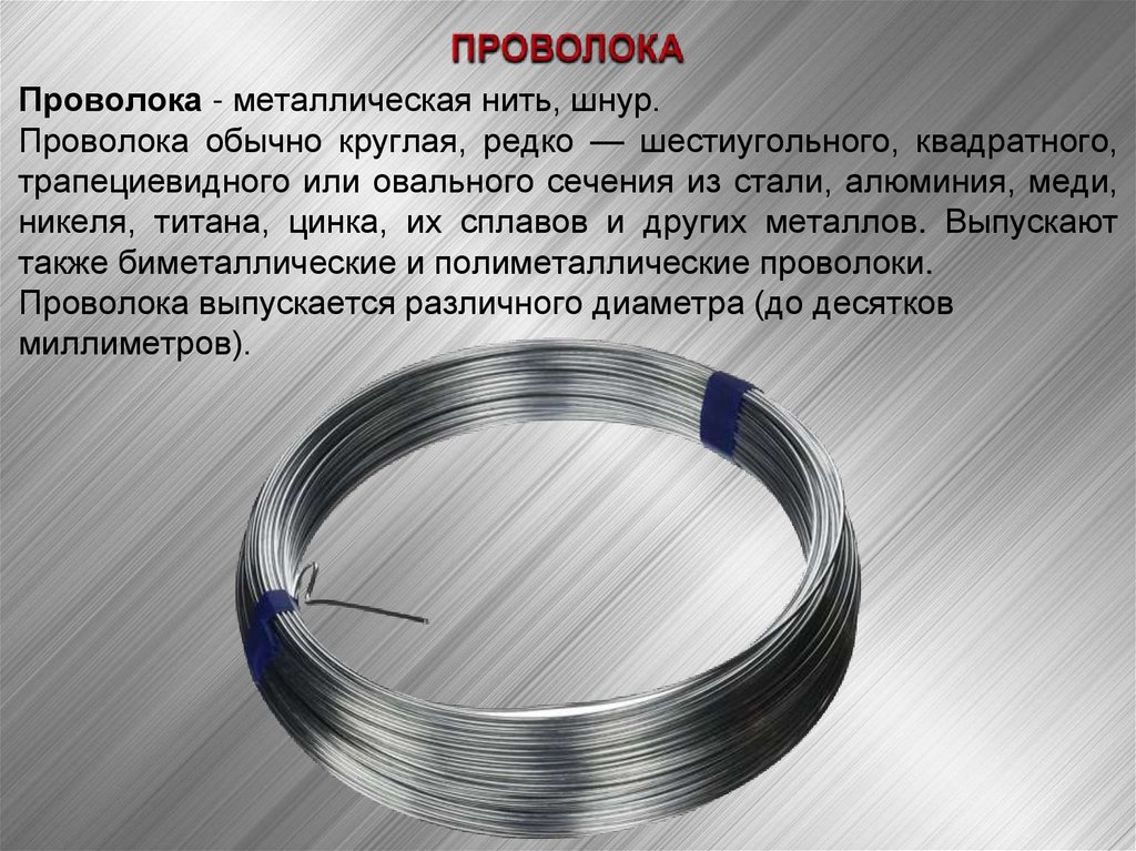 - металлическая нить, шнур.Проволока обычно круглая, редко — шестиугольного, квадратного,