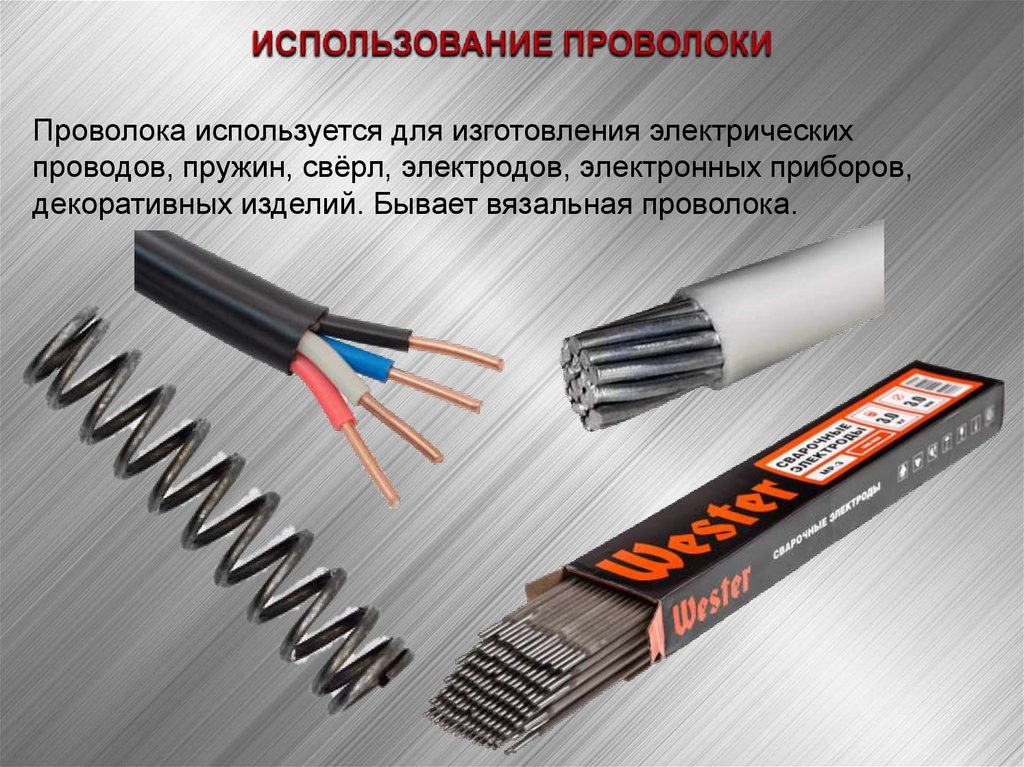 Проволока используется для изготовления электрическихпроводов, пружин, свёрл, электродов, электронных приборов,