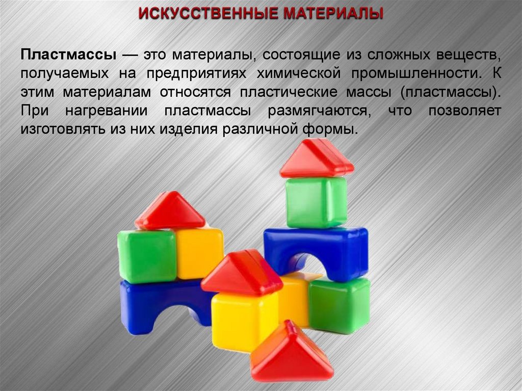 Пластмассы — это материалы, состоящие из сложных веществ,получаемых на предприятиях химической промышленности. К