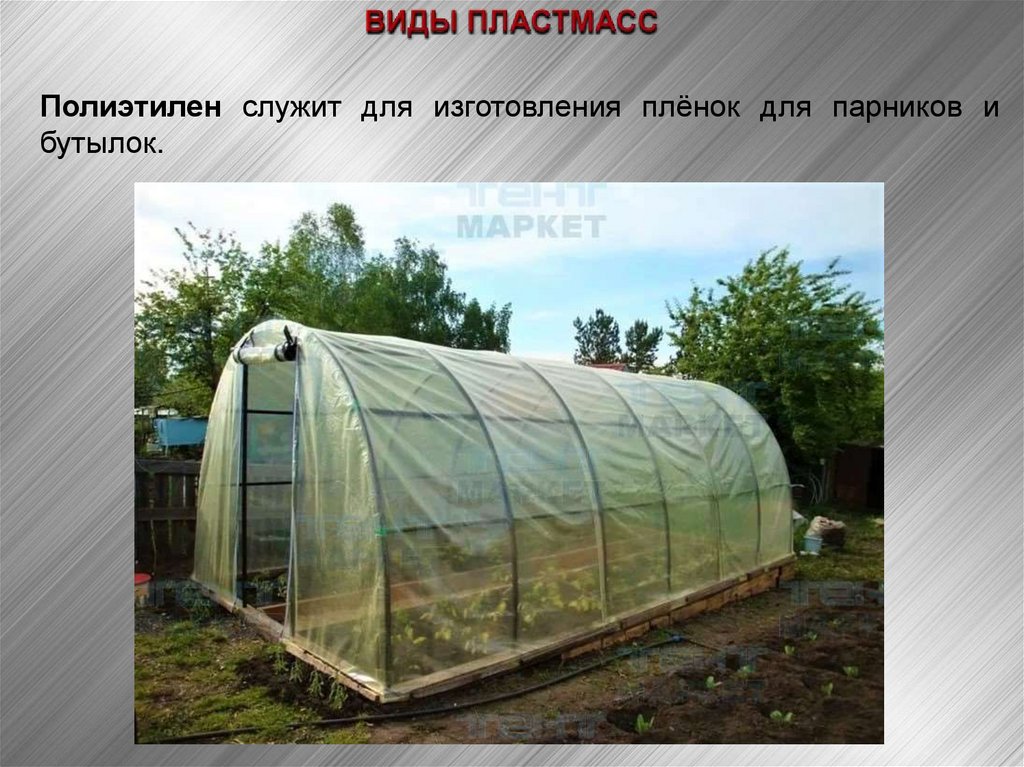 Полиэтилен служит для изготовления плёнок для парников ибутылок.
