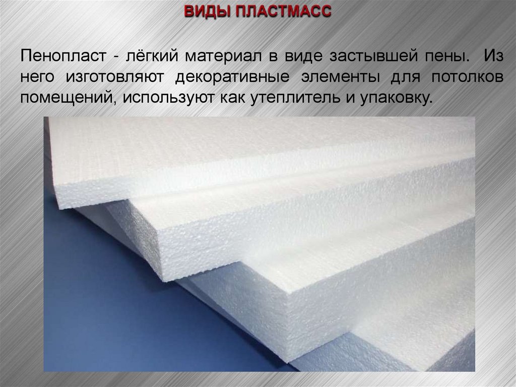 Пенопласт - лёгкий материал в виде застывшей пены. Изнего изготовляют декоративные элементы для потолков