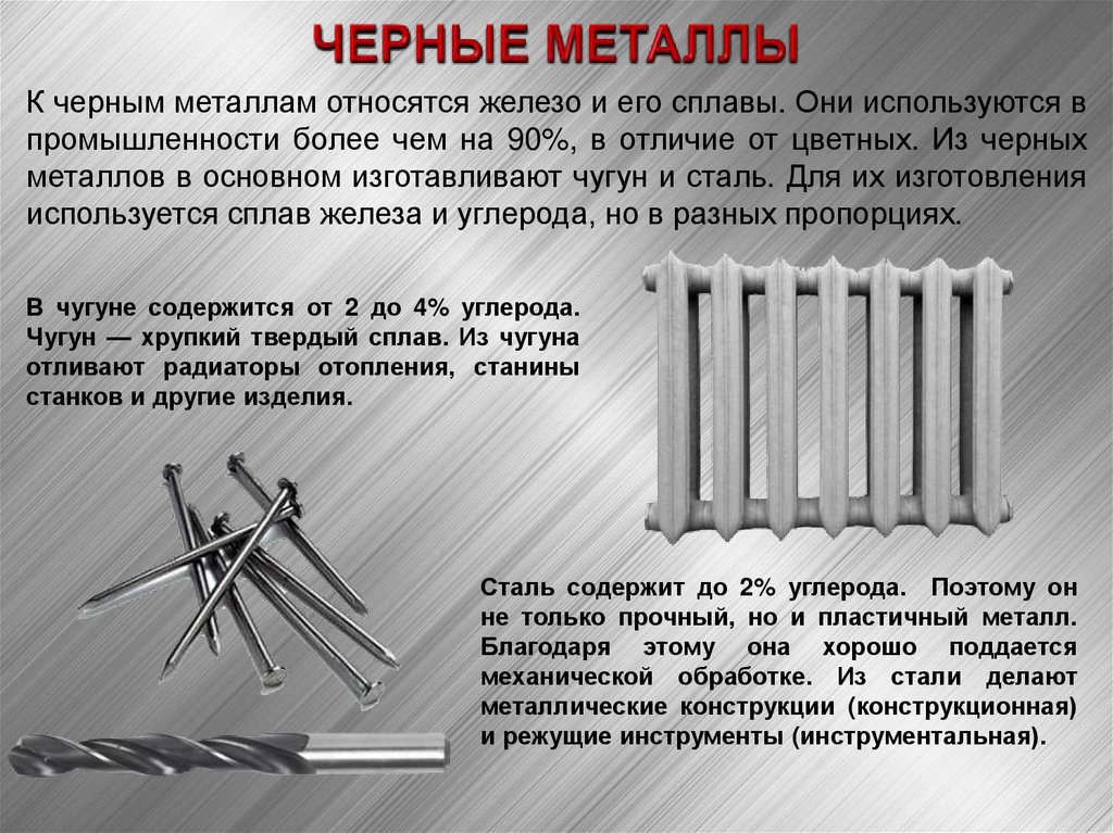 К черным металлам относятся железо и его сплавы. Они используются впромышленности более чем на 90%, в отличие от цветных. Из черных