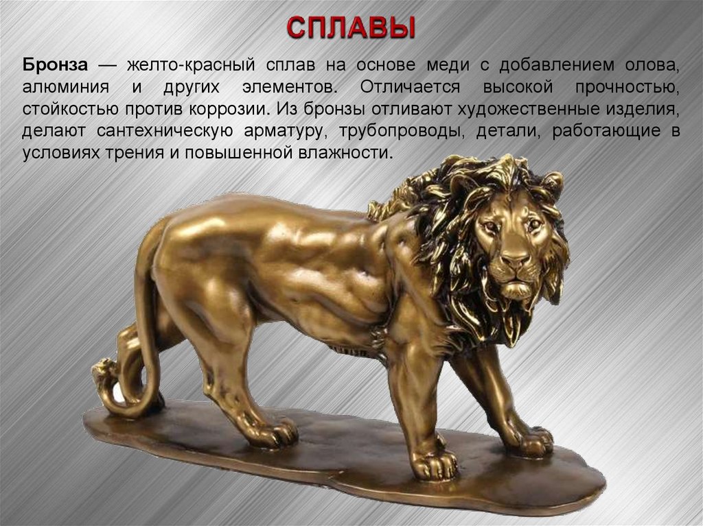 Бронза — желто-красный сплав на основе меди с добавлением олова,алюминия и других элементов. Отличается высокой прочностью,
