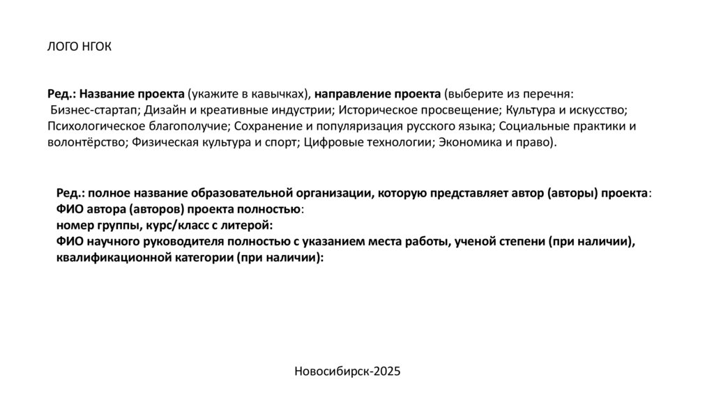 ЛОГО НГОКРед.: Название проекта (укажите в кавычках), направление проекта (выберите из перечня: