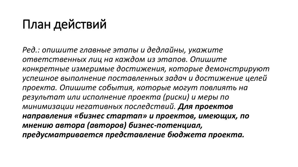 Ред.: опишите главные этапы и дедлайны, укажитеответственных лиц на каждом из этапов. Опишите
