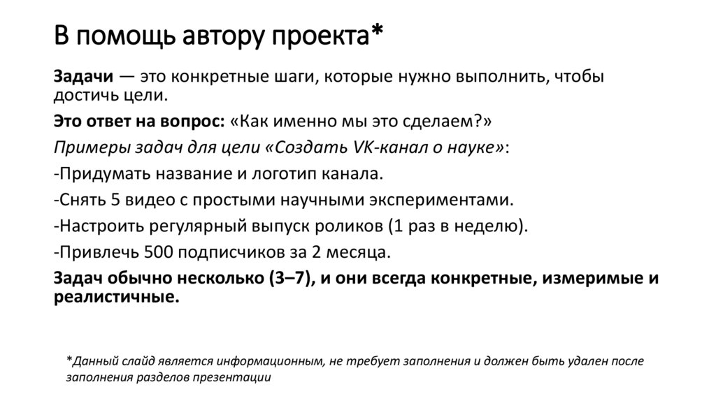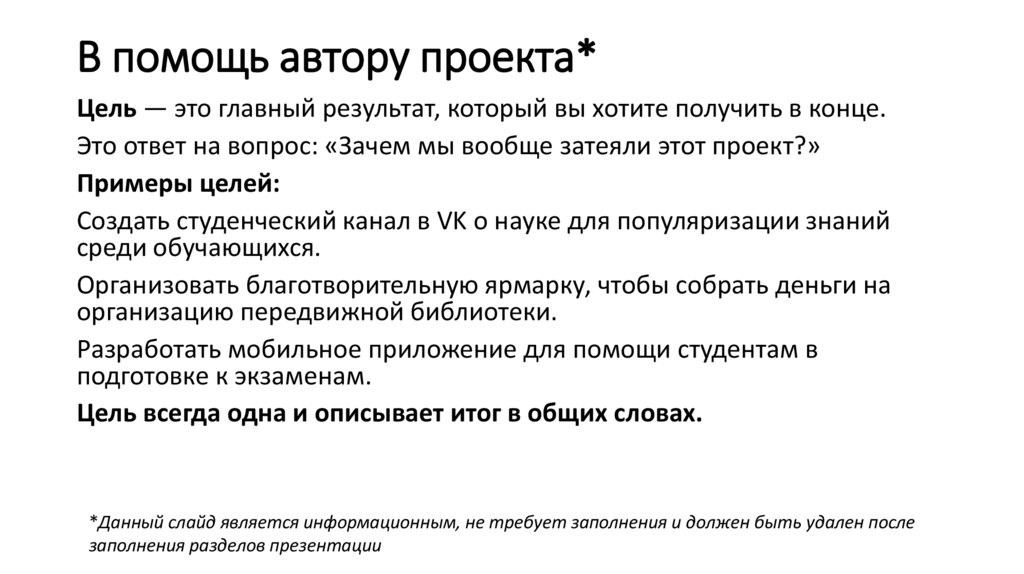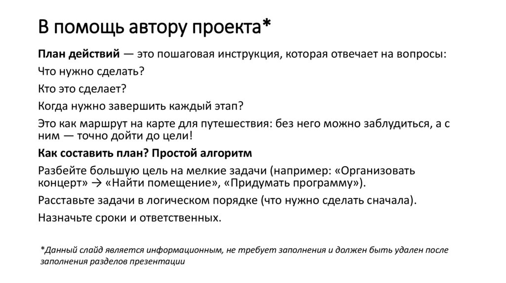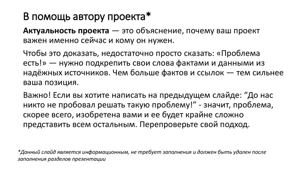 1. Следуйте порядку слайдов в шаблоне.2. Используйте подсказки на страницах «В помощь автору проекта», чтобы не