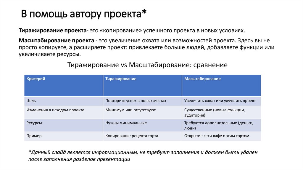 Тиражирование проекта- это «копирование» успешного проекта в новых условиях.Масштабирование проекта - это увеличение охвата или возможностей проекта. Здесь вы не