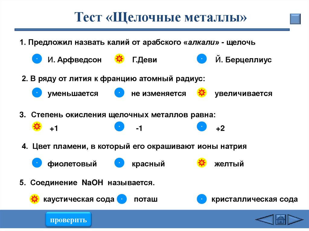 Тест «Щелочные металлы»1. Предложил назвать калий от арабского «алкали» - щелочь