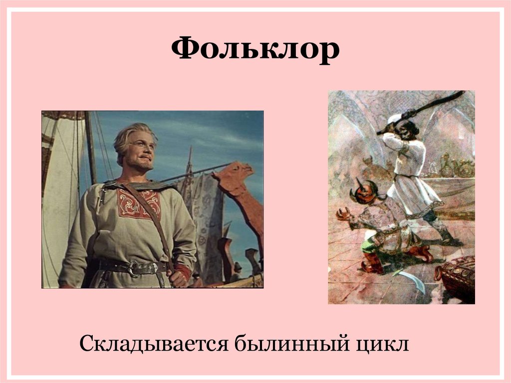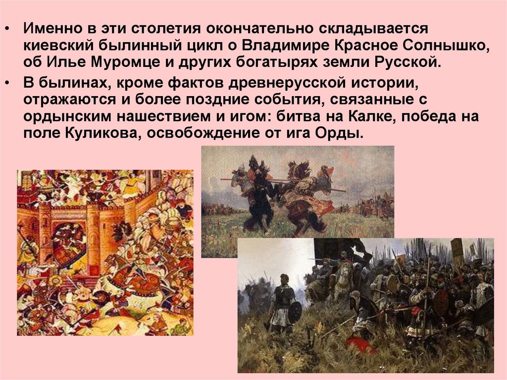 • Именно в эти столетия окончательно складываетсякиевский былинный цикл о Владимире Красное Солнышко,