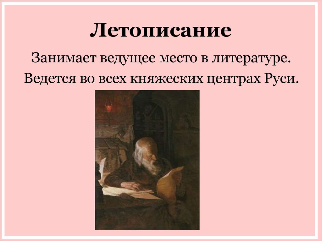 Занимает ведущее место в литературе.Ведется во всех княжеских центрах Руси.