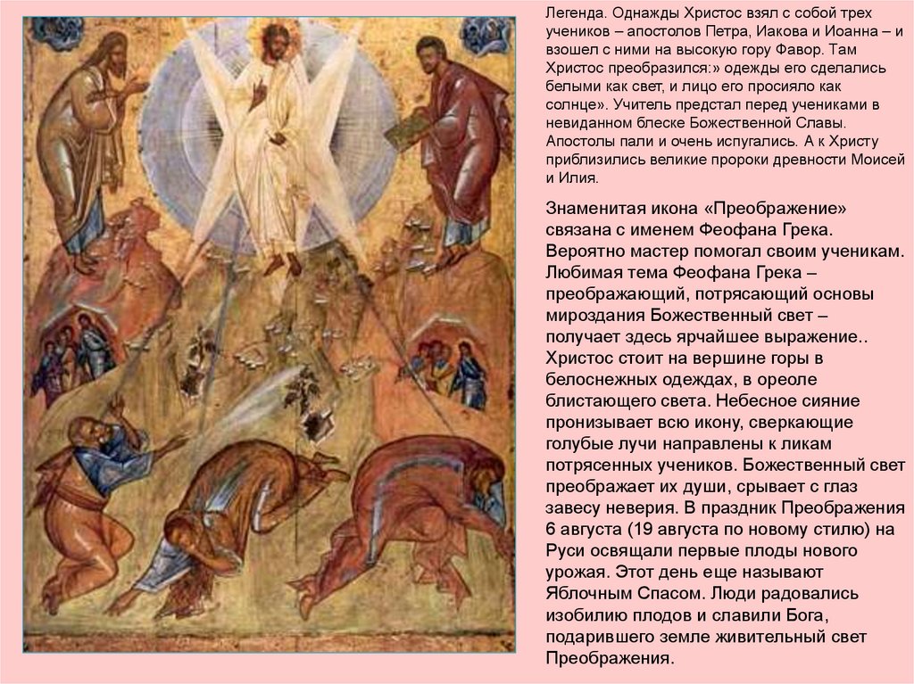 Легенда. Однажды Христос взял с собой трехучеников – апостолов Петра, Иакова и Иоанна – и