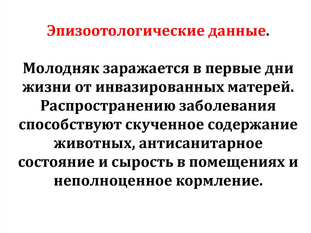 13. Эпизоотологические данные. Молодняк заражается в первые дни жизни от инвазированных матерей. Распространению заболевания