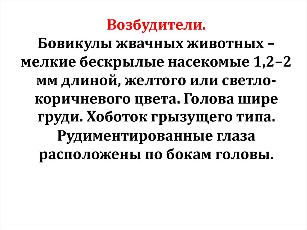 5. Возбудители. Бовикулы жвачных животных – мелкие бескрылые насекомые 1,2–2 мм длиной, желтого или светло-коричневого цвета.