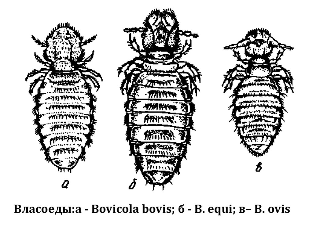 7. Власоеды:a - Bovicola bovis; б - B. equi; в– В. ovis